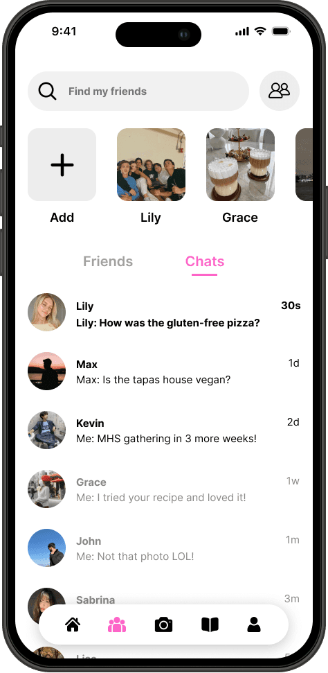 Ironically, we felt that Instagram was too impersonal for developing and maintaining friendships due to the ‘picture-perfect’ culture within the platform. The well-curated profiles rarely reflected people’s real lives, creating a pressure to maintain a ‘picture-perfect’ appearance. Unfortunately, our design eventually mirrored this impersonality this experience in some features.