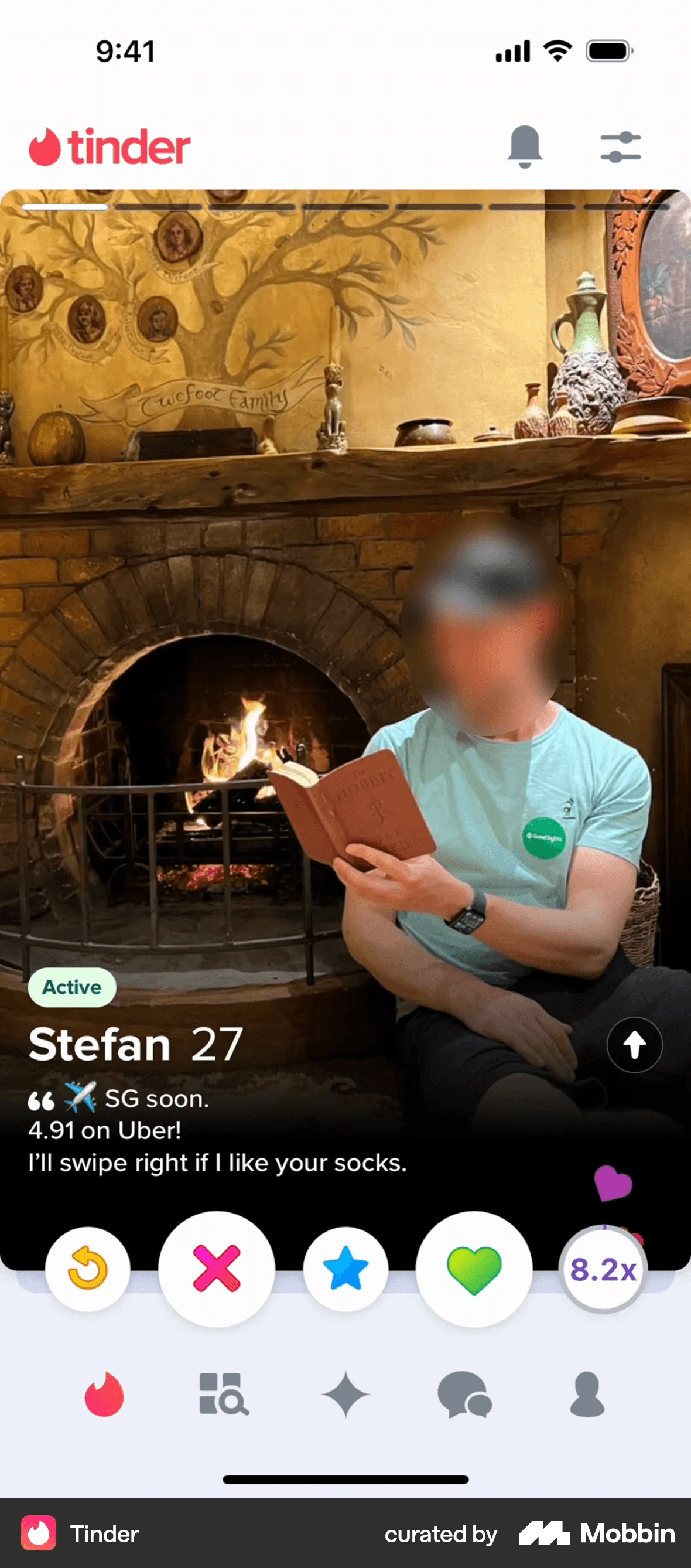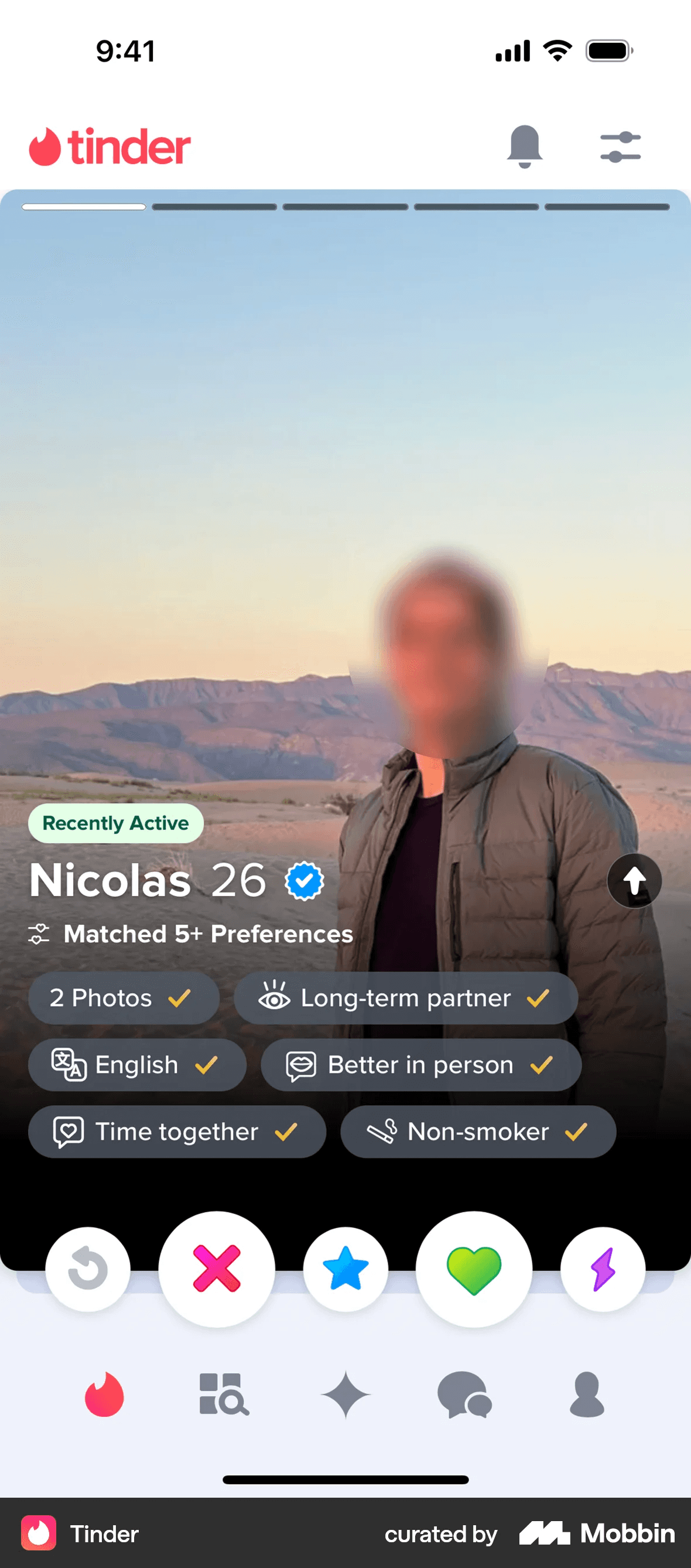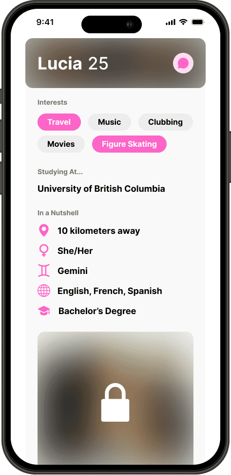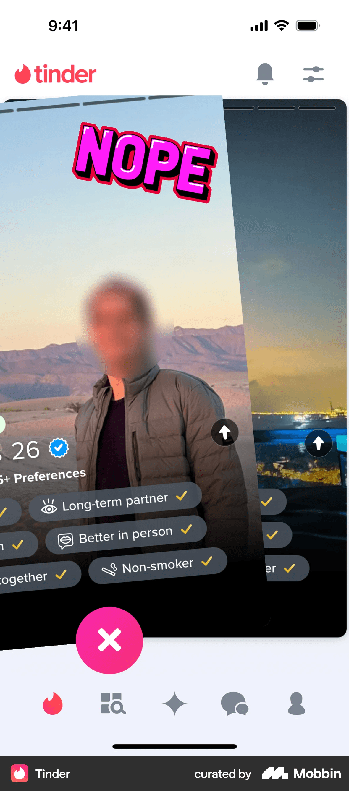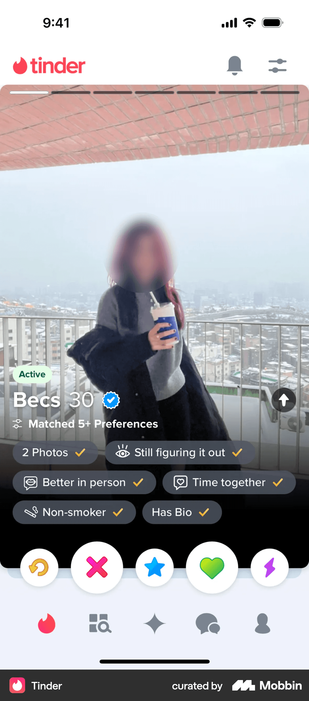 Tinder, arguably the most recognizable dating app, embodies the fast-paced, appearance-driven culture it’s known for. The carousel of photos displayed as the thumbnail for each profile encourages quick, surface-level decisions, often reducing individuals to “judge a book by its cover” attitudes. Its swiping feature further amplifies this behaviour with its distinct gamification from the bold stickers and playful effects that make swiping addictive.
