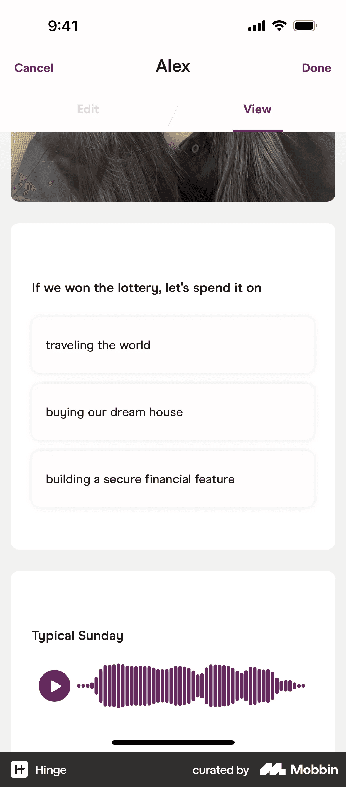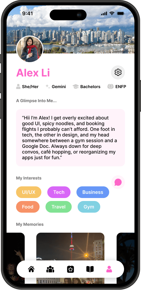 For one-to-one connections, I drew inspiration most from Hinge and Bumble, which encouraged users to share meaningful insights into their personalities. Weave includes foundational details, such as gender, age, education level, and spoken languages, but the focus extends beyond the basics. I incorporated the text and voice-based prompts of Hinge and Bumble give users a fuller understanding of one’s personality and provide a glimpse into what kind of potential friend they may be.