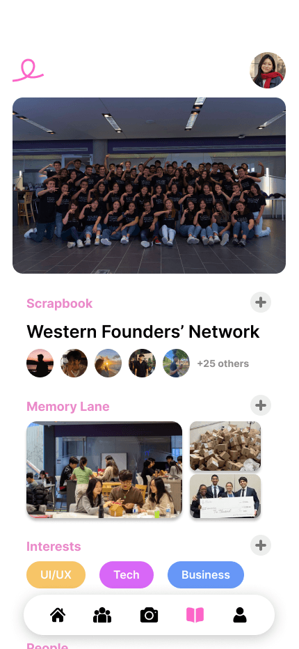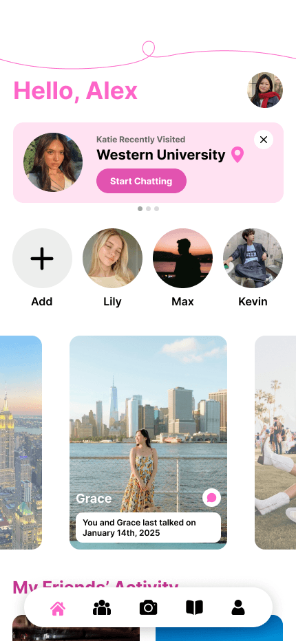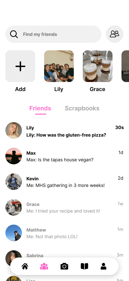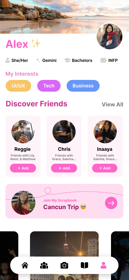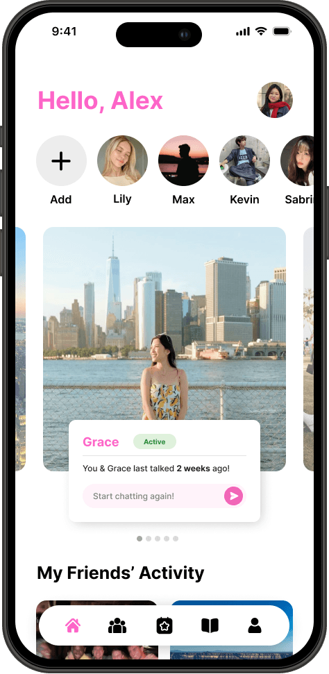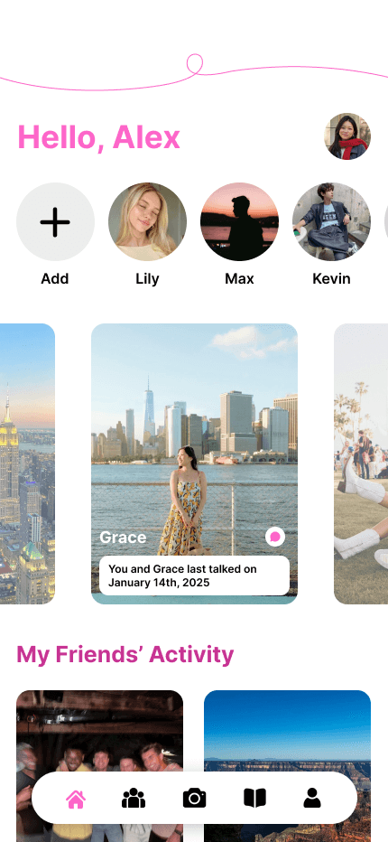I designed the home and scrapbook pages to revolve around memory-sharing to support ongoing friendships. On the home page, a carousel of photos displays friends the user hasn’t contacted in a while using shared photos as reminders of moments spent together. Each friend in the carousel also includes a prompt to reconnect and a indicator of how long it’s been since the last interaction. Weave also includes “My Friends’ Activity,” highlighting recent memories friends have shared.