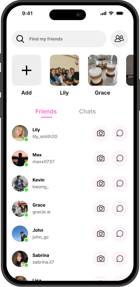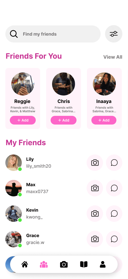 Home page: Showed updates on friends’ activities, similar to Instagram and Snapchat stories