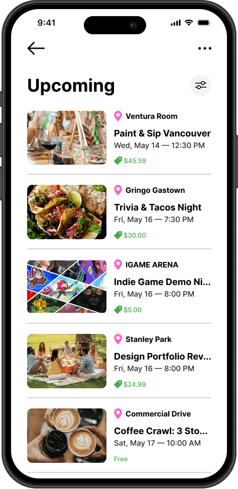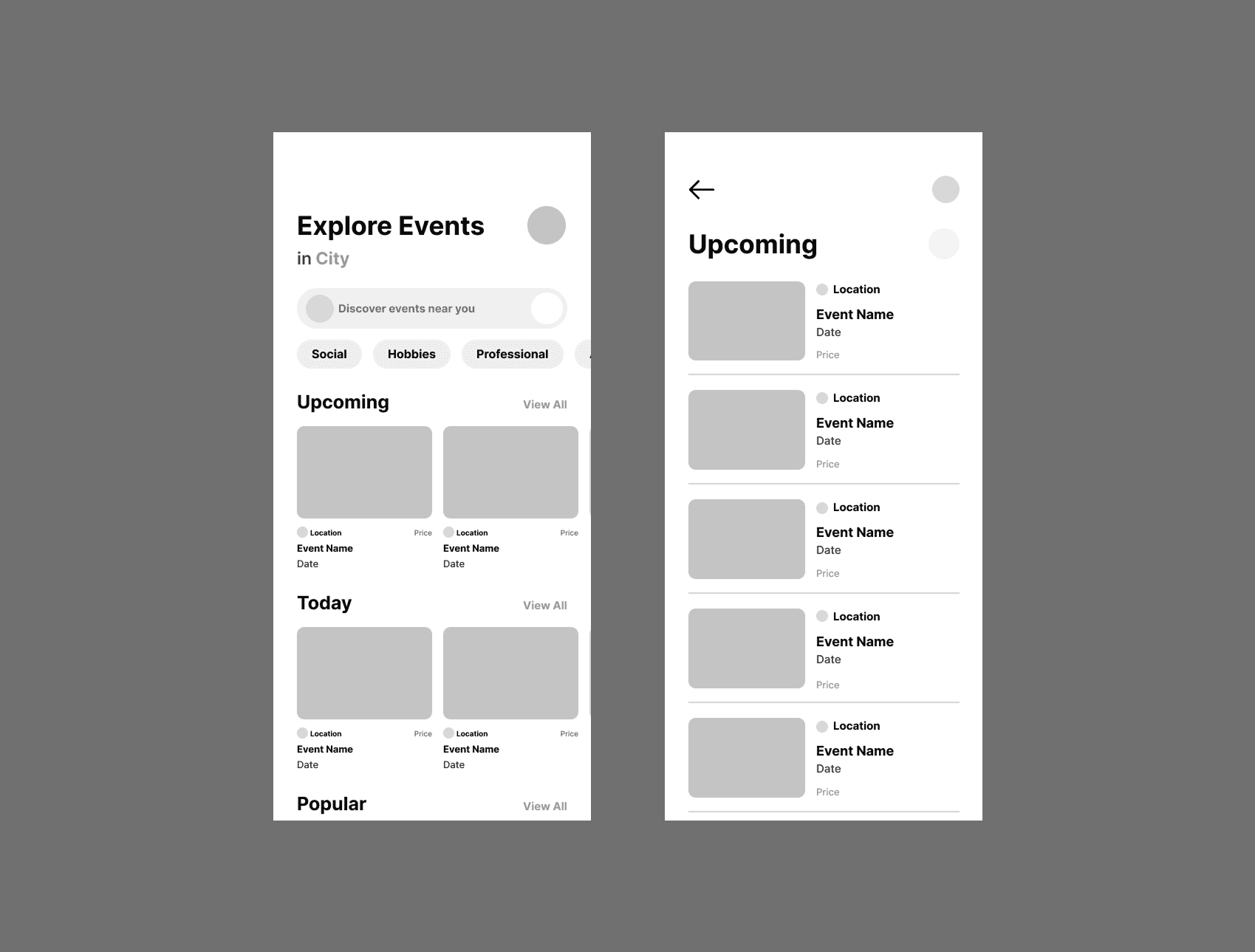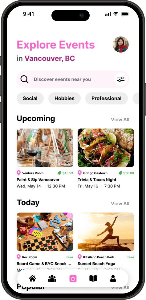 To give users who prefer more structured ways to meet potential friends, I included an events page inspired by apps like Meetup, Luma, and Eventbrite. These apps excel at organizing interest-based events and activities so I took inspiration from their layouts and information architecture. Weave highlights upcoming events near the user’s location and allows them to filter events by interests.