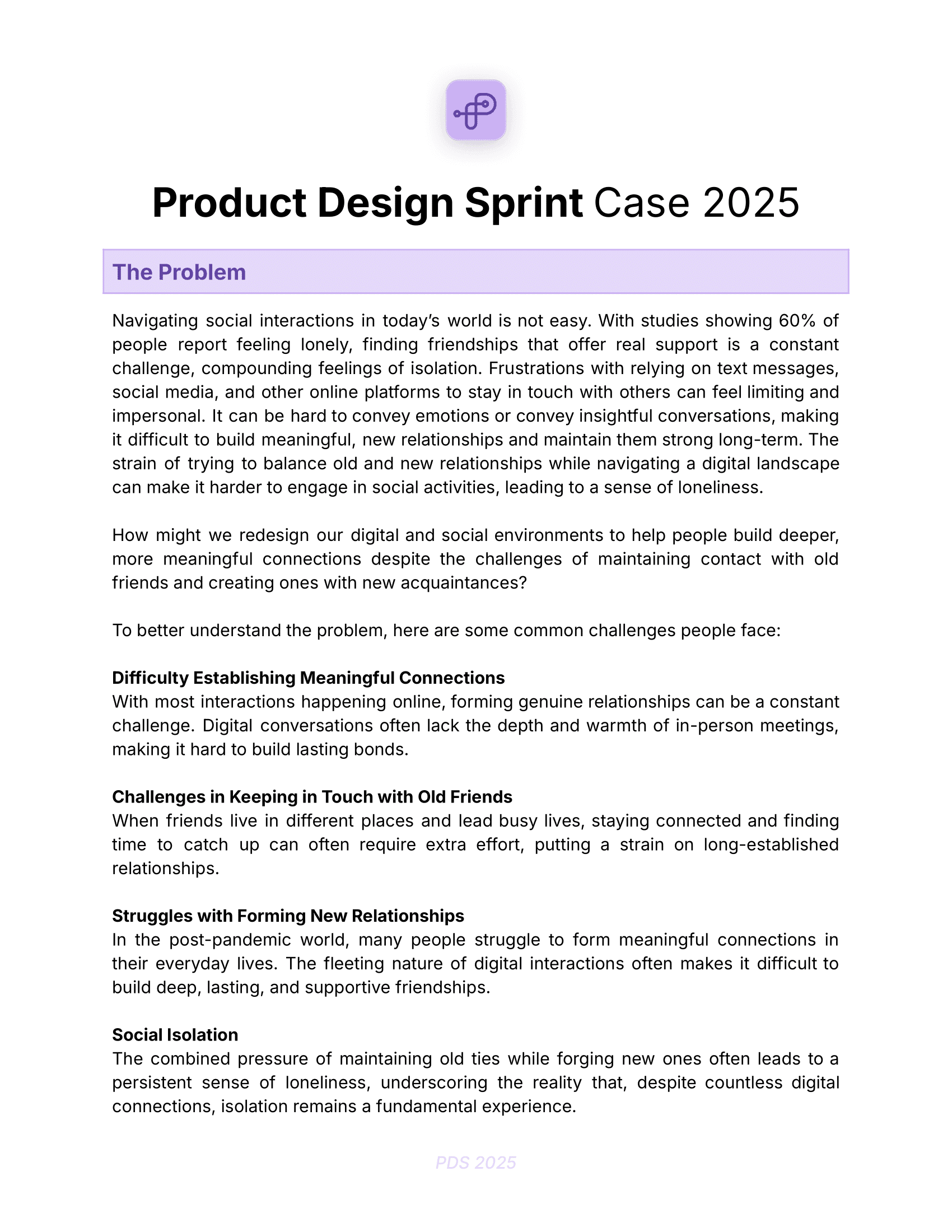 In 2024, I attended a three-day product design sprint at The University of Western Ontario. The challenge was to develop a digital product that would help individuals to develop and maintain meaningful friendships. Although we did not win this competition, I took it as a valuable stepping stone in my growth as a designer.