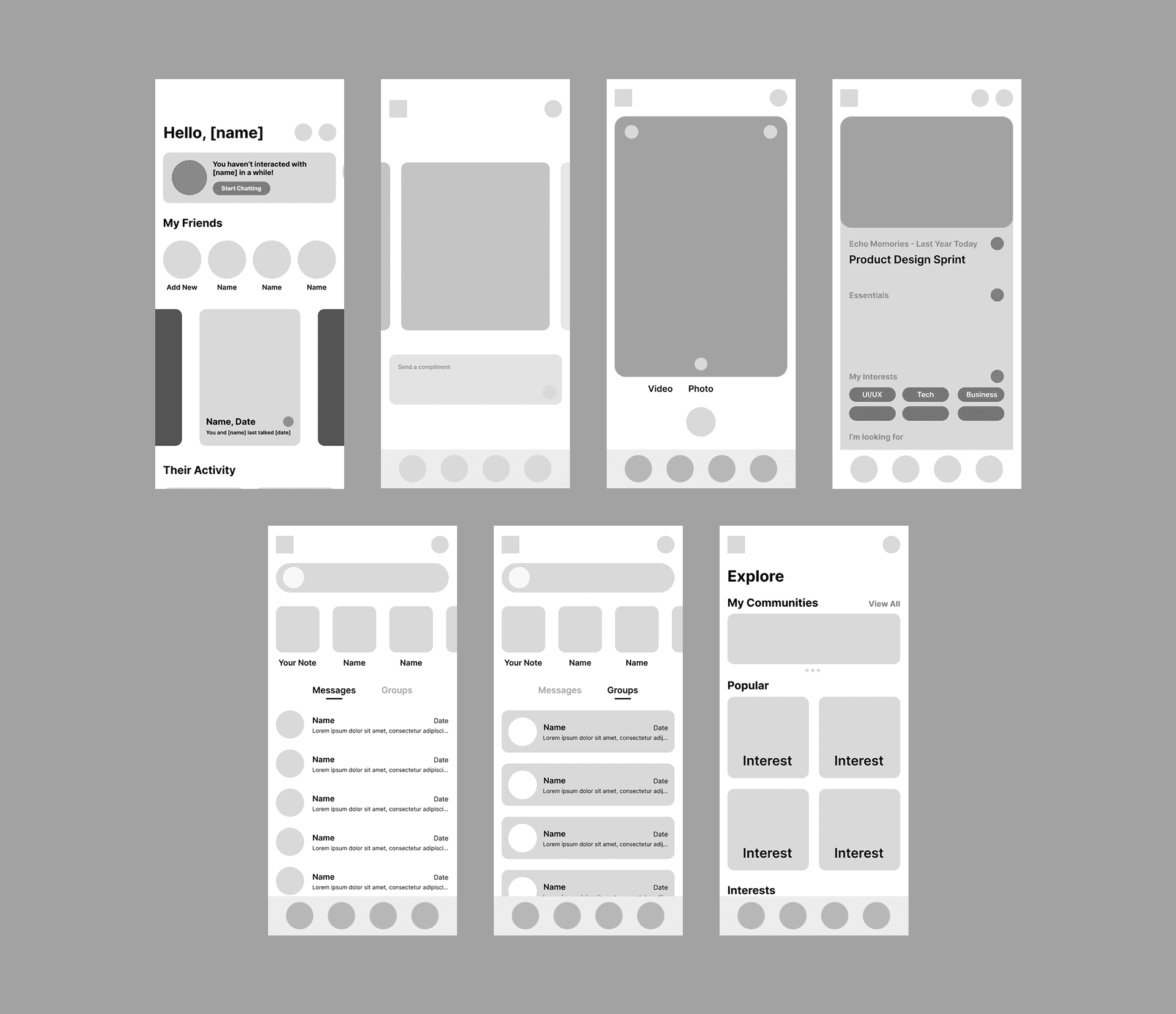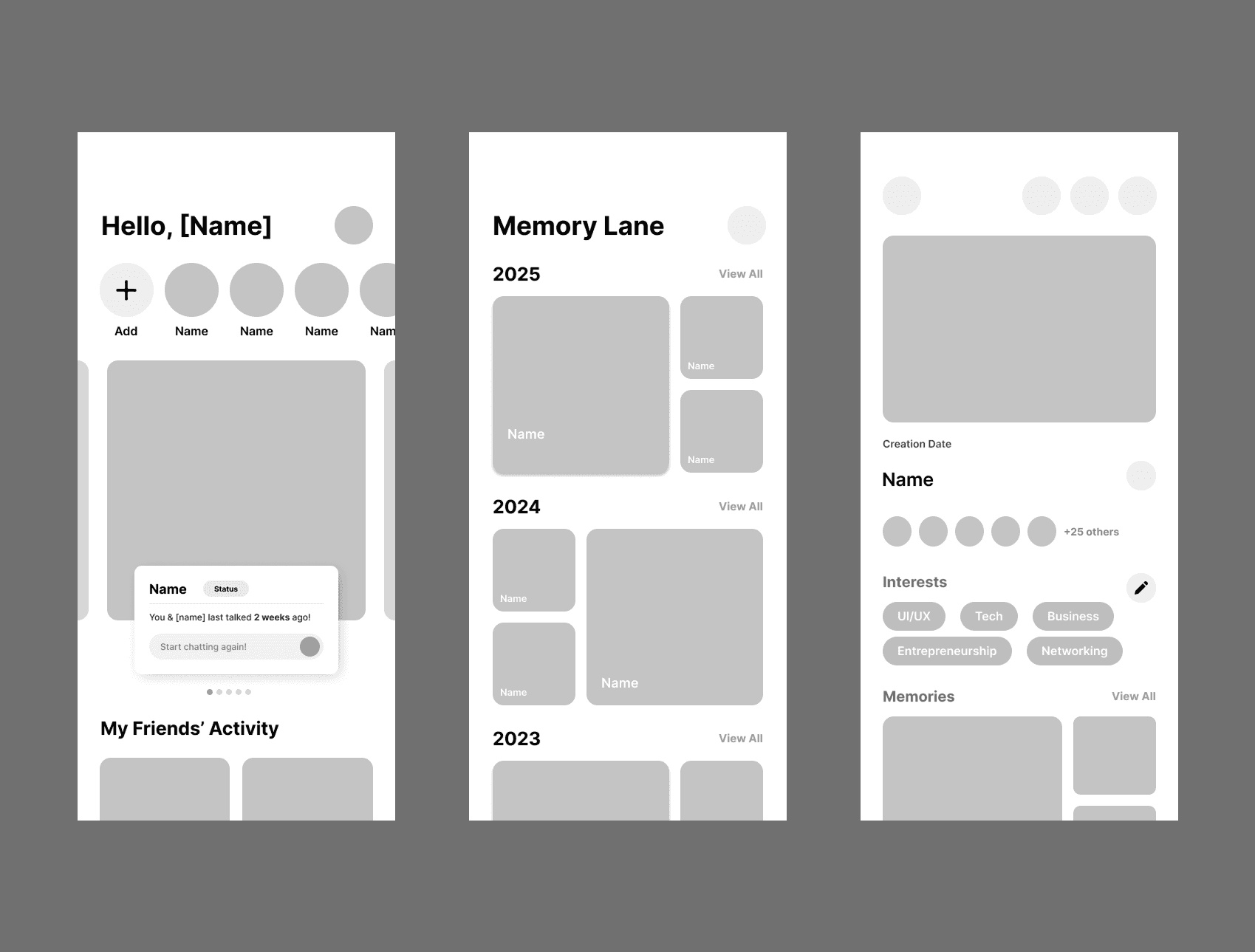 With the insights gained from my analysis, I set out to re-invent Weave. To maintain the theme of maintaining relationships, I kept the Memory Lane concept as it was one of the strongest elements for sustaining and re-kindling friendships. However, this time, I prioritized the friend-making experience in addition.