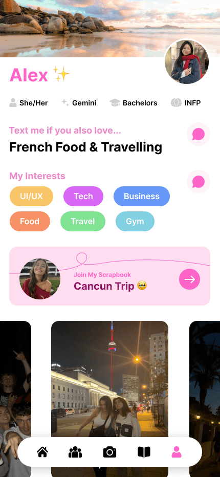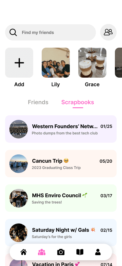 The scrapbook feature draws inspiration from Apple Photos’ organizational structure. Users can create scrapbooks by grouping photos into meaningful collections and share those albums with friends, reinforcing connection through shared history.