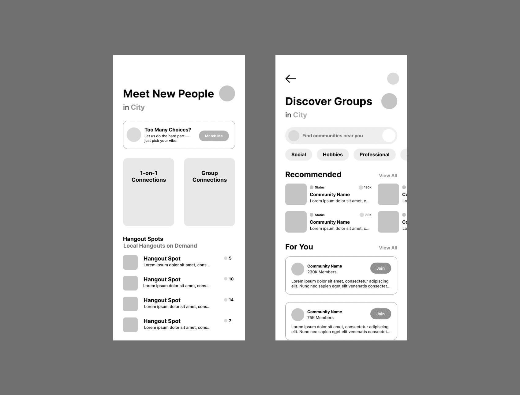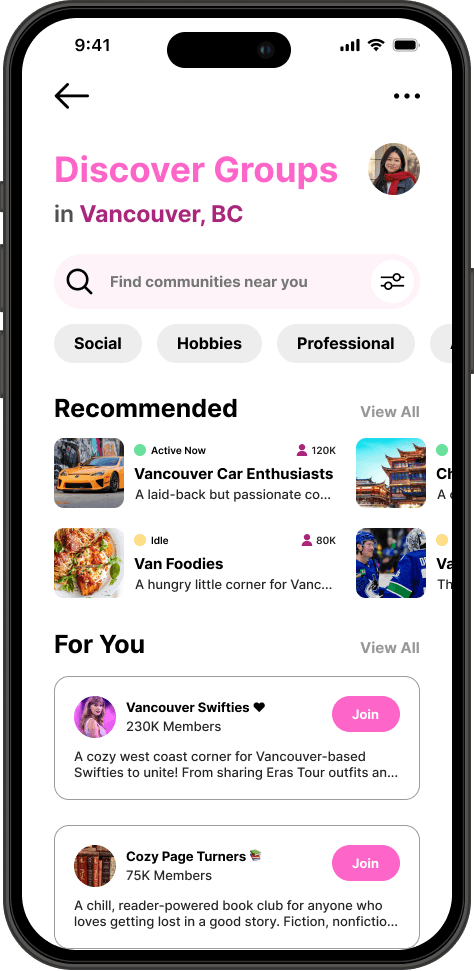 As for group-based connections, I introduced a community discovery feature inspired by apps like Reddit, Facebook Groups, Discord, and Meetup. Weave recommends popular communities, suggests groups based on the user’s interests, and provides topic-based filters for users looking for something more specific. Each community displays an activity status so users can gauge liveliness of the community before joining.
