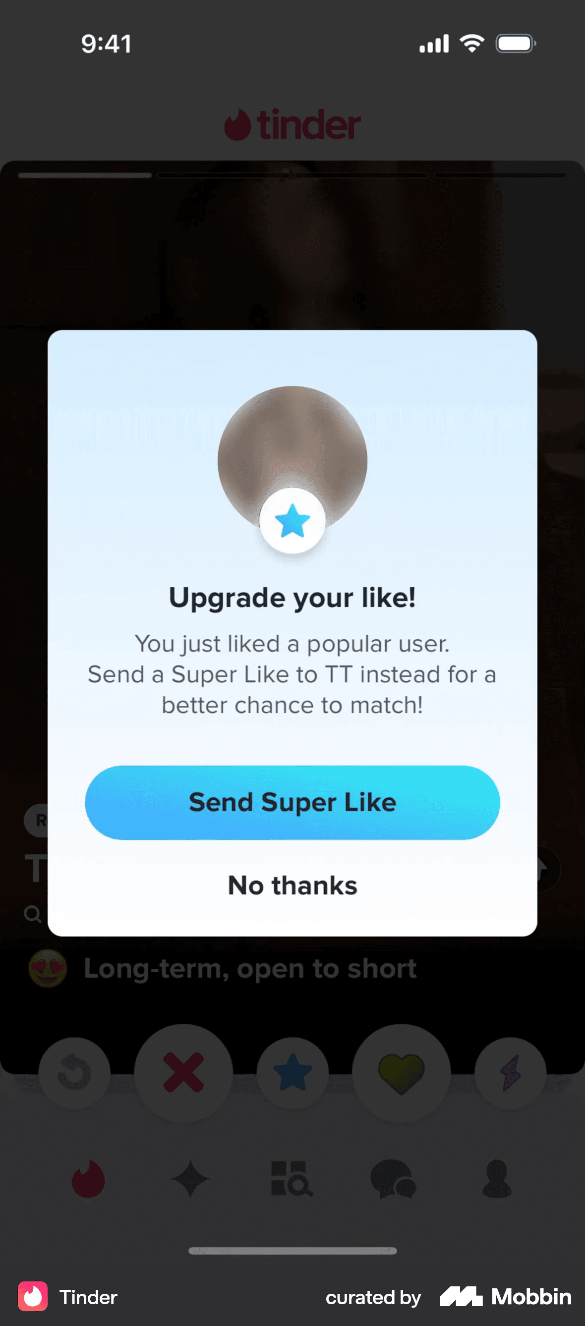 Tinder’s gamification extends to features like Super Likes and Boosts, all brightly designed and reminiscent of power-ups in a game. Although they undoubtedly boost paid transactions within the app, they can feel impersonal to the user.
