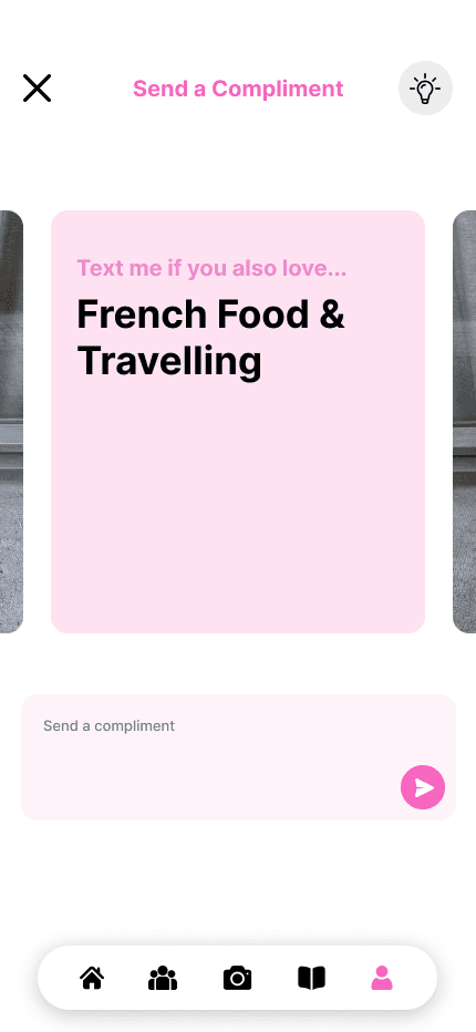 Where other dating apps lack, Bumble excels in fostering personality-driven connection through numerous conversation prompts like ‘fun questions’ that offer a glimpse into one’s character. These prompts encourage more meaningful conversations than photos and basic information can provide. The Compliments feature further solidifies by providing users with another point of conversation on photos and prompts. Taking inspiration from these elements, I incorporated them into my new design for Weave, as I wanted to encourage connection beyond surface-level judgements based on appearances.